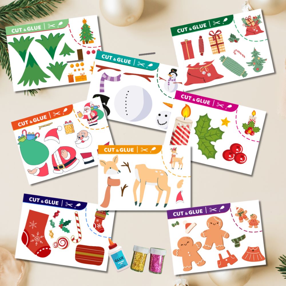A fun and festive Christmas cut and paste activity for kids! Perfect for building fine motor skills while creating cute holiday scenes with Santa, reindeer, gifts, and more.