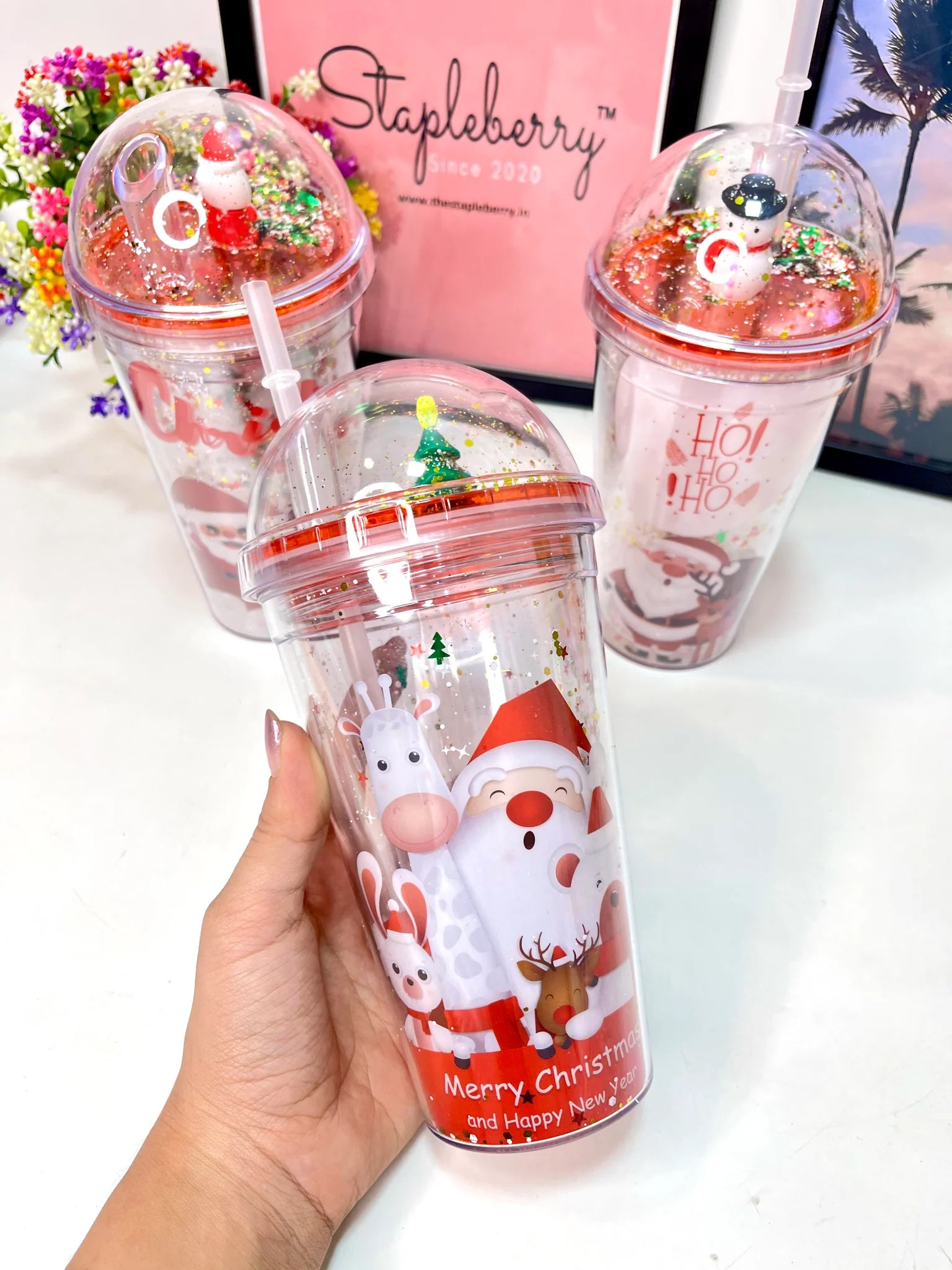 Festive Design: Adorable Christmas-themed sipper featuring Santa, reindeer & snowman prints.