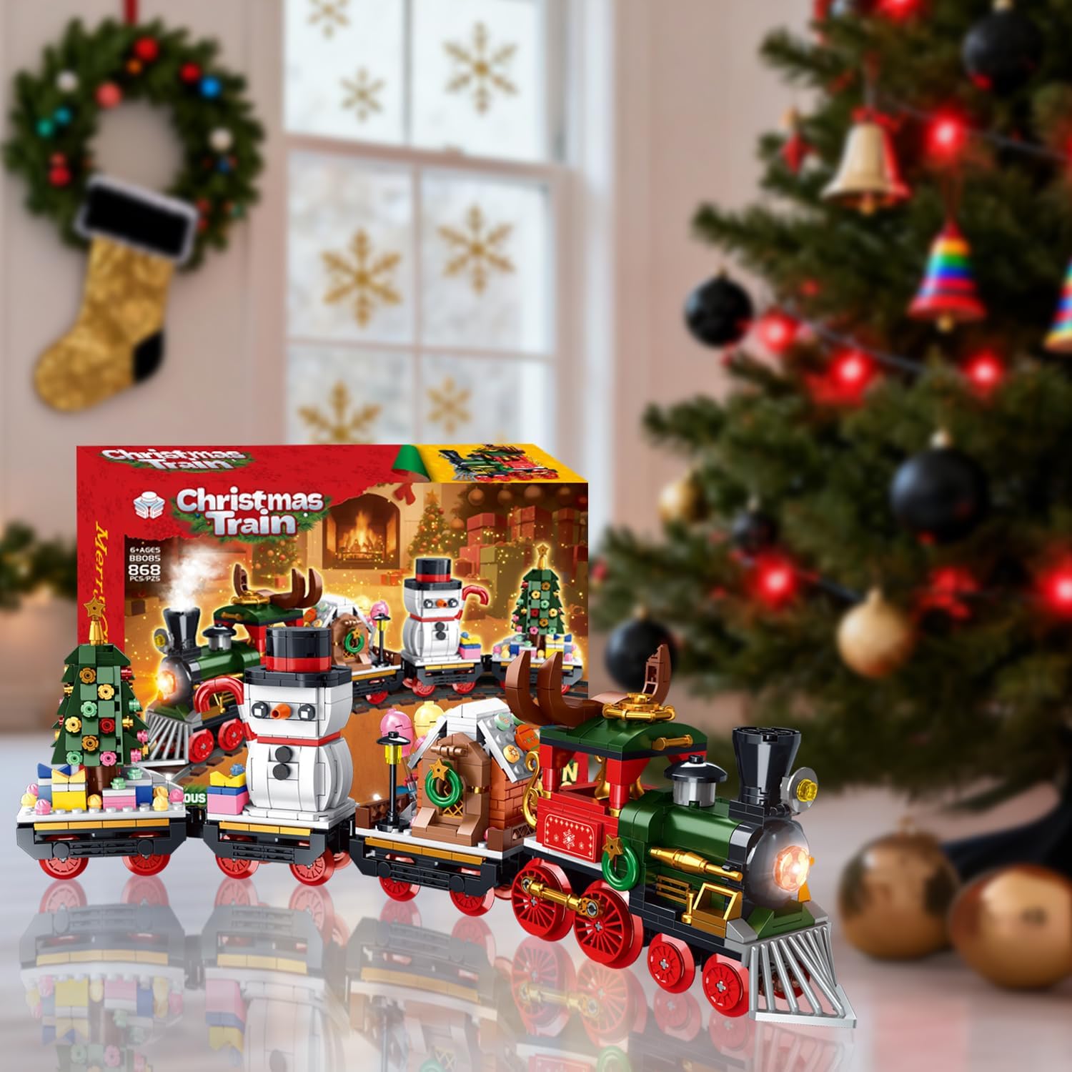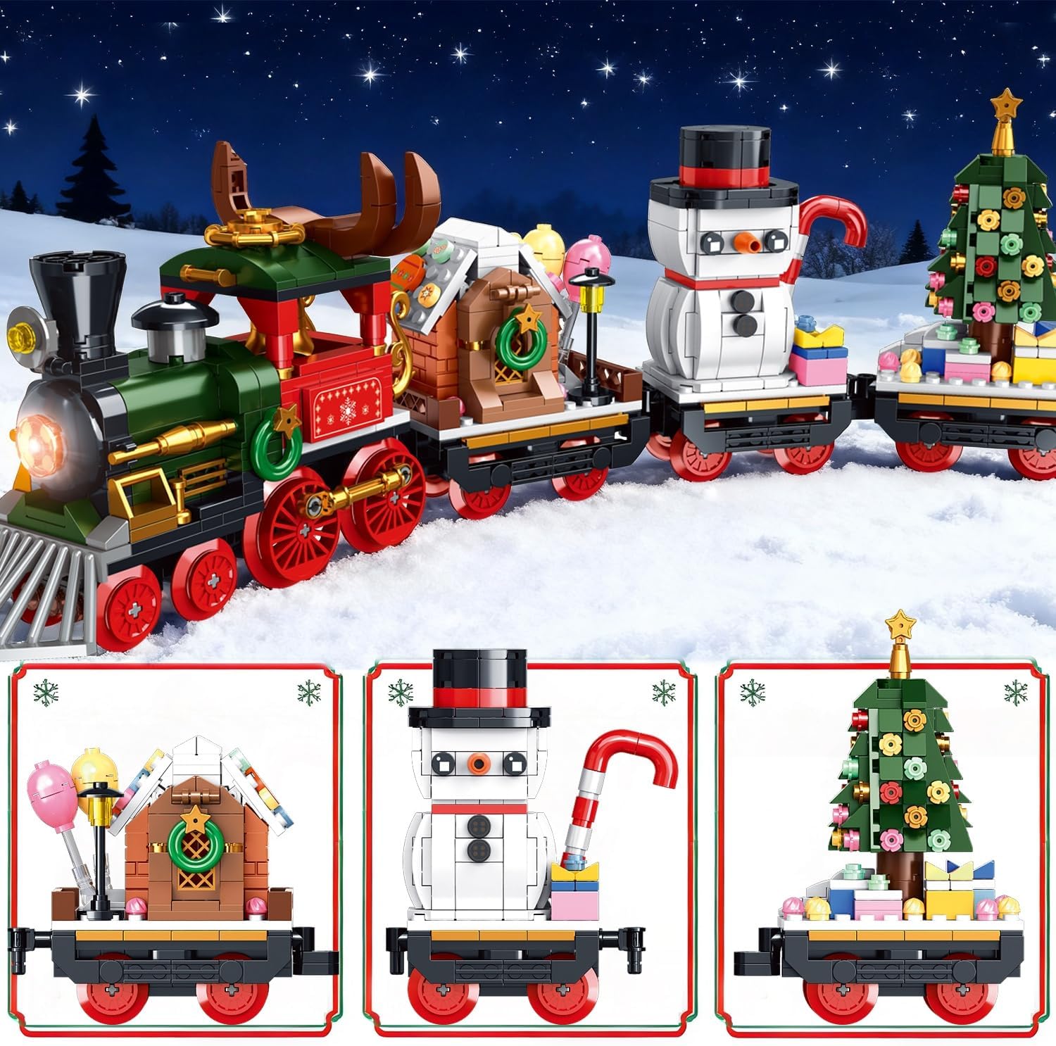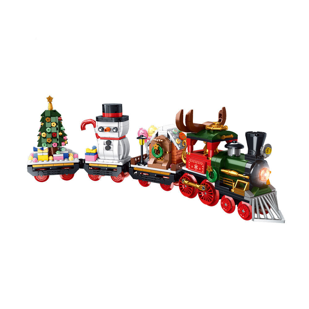 Festive Design: Features a Christmas-themed train with vibrant holiday colors and decorations, including a reindeer engine, a snowman, and a festive Christmas tree.