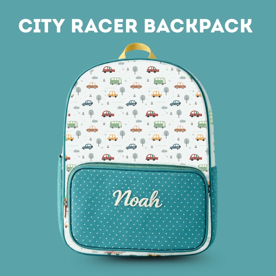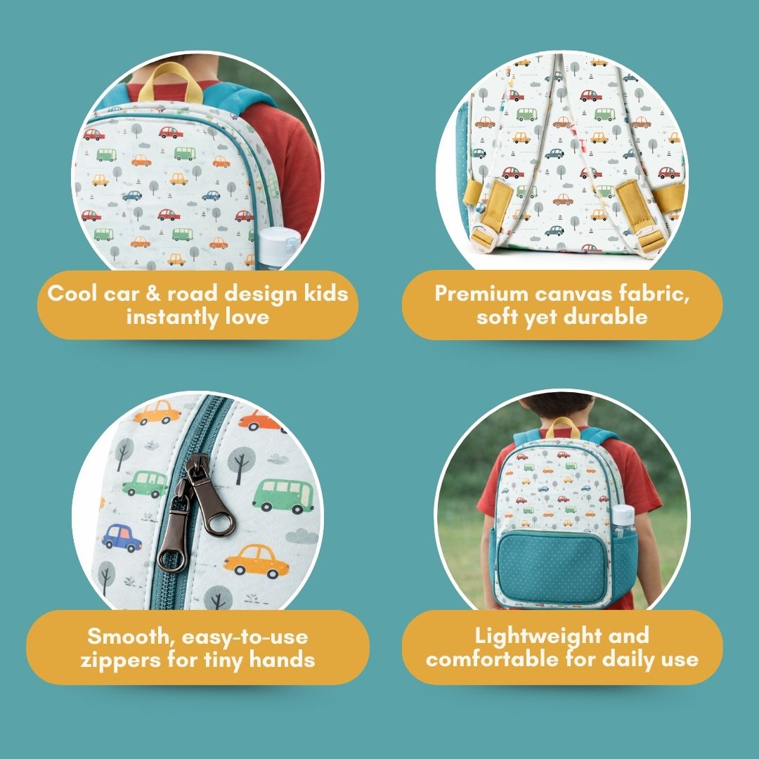Cots and Cuddles Cute Vehicles Theme Printed Canvas Backpack for Kids