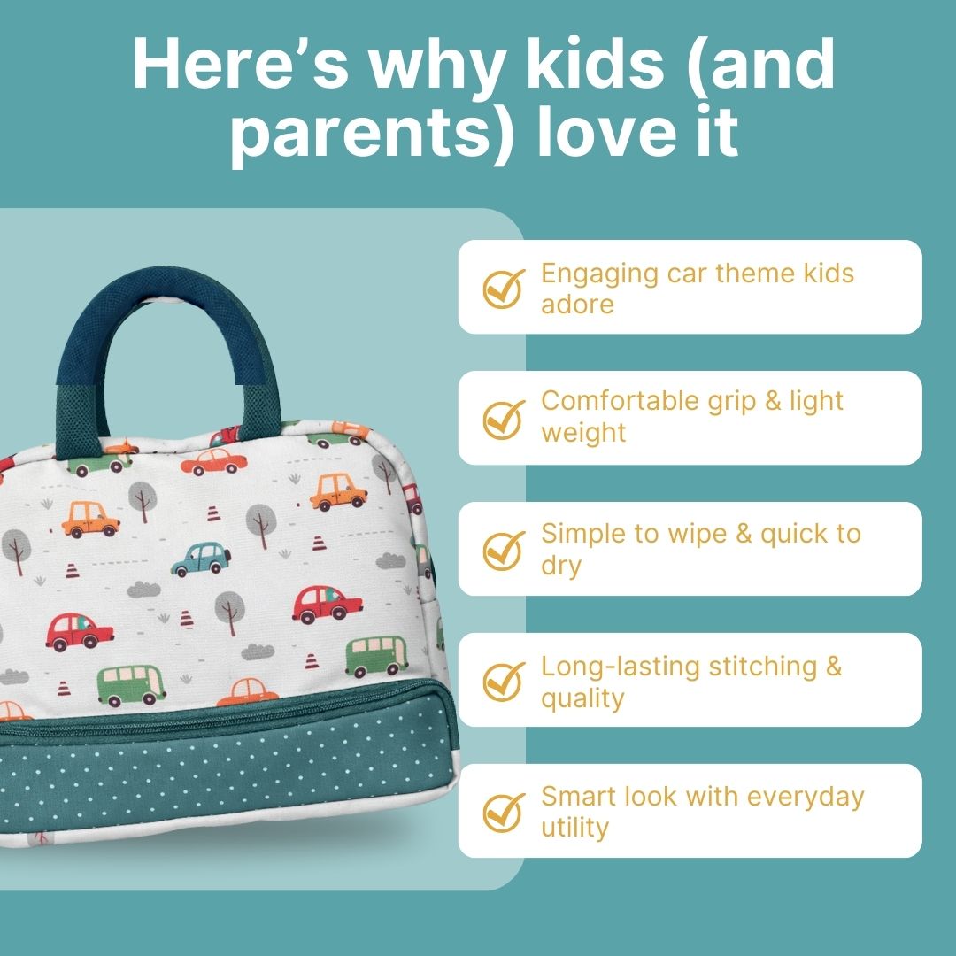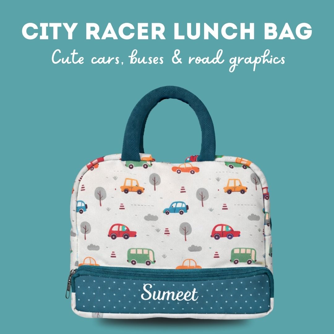 Cots and Cuddles Cute Vehicles Theme Printed Canvas Lunch Bag for Kids