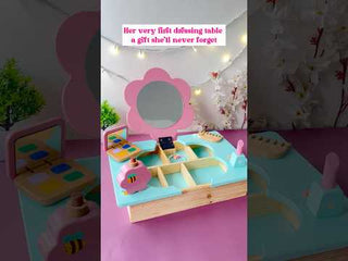 Wooden Dressing Table Playset for Kids – Beautifully crafted pretend play vanity set with flower-shaped mirror and storage compartments.