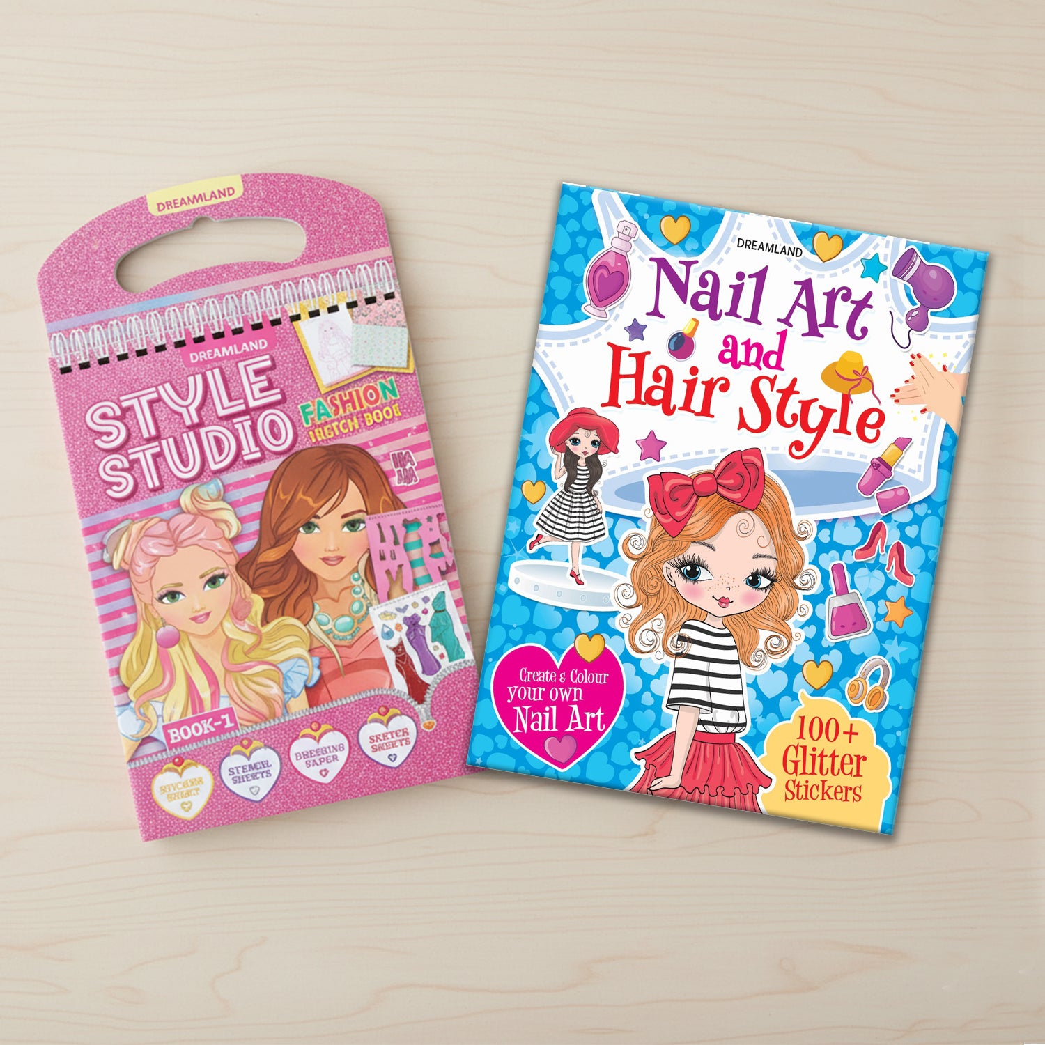 Style Studio Fashion Sketch Activity Book Part-1 with Nail Art and Hair Style- Create and Colour Your Own Nail Art with 150 Glitter Stickers, Activity Book Pack of 2