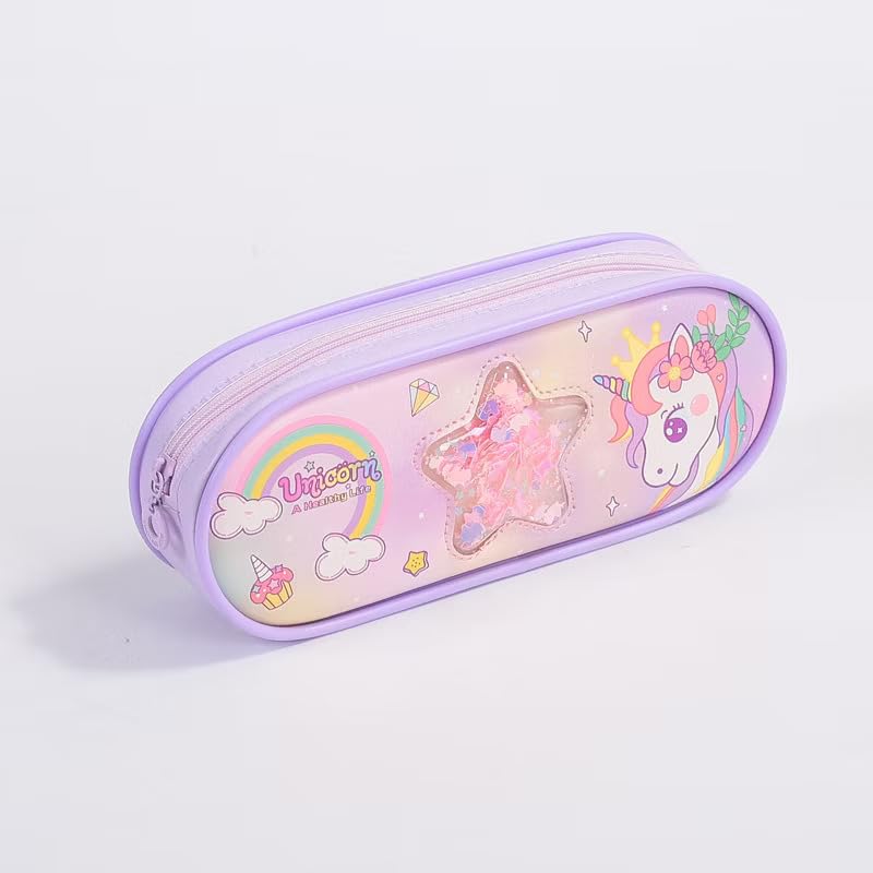 Designed in dreamy pastel shades with a cute unicorn print and a moving glitter-filled star window, this pouch keeps stationery safe and stylish. Its spacious interior easily fits pens, pencils, erasers, sharpeners, and more — perfect for school, tuition, or creative playtime.